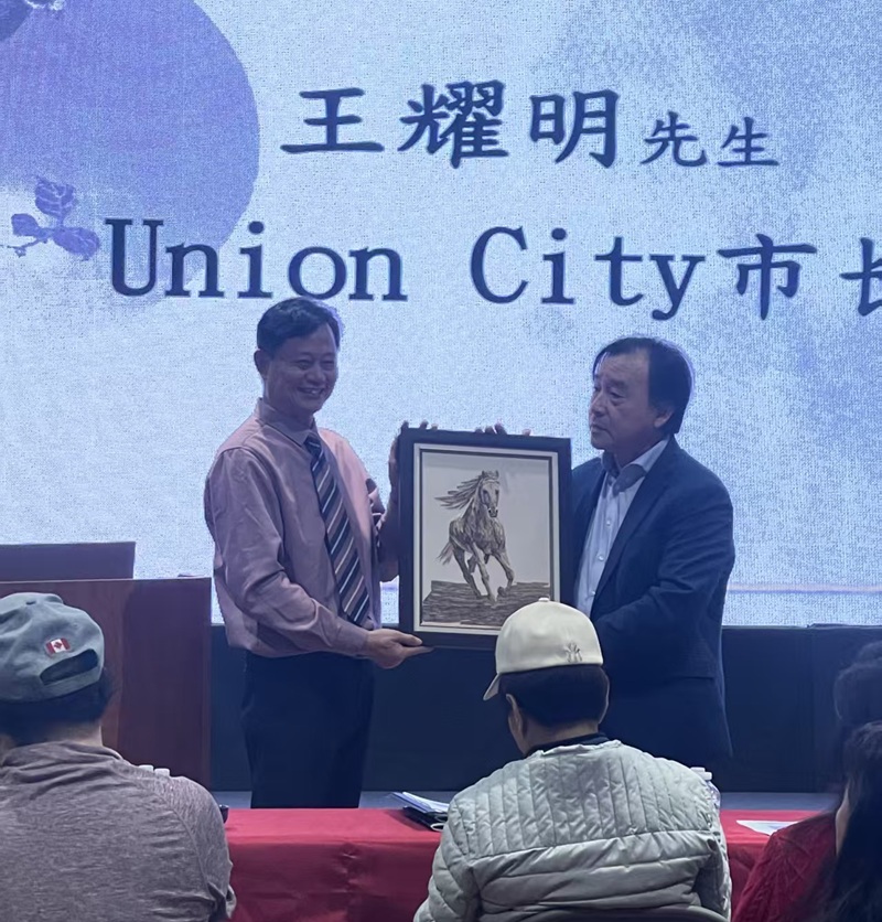 汪科元赠送《沉香骏马》给Union City 市副市长王耀明。