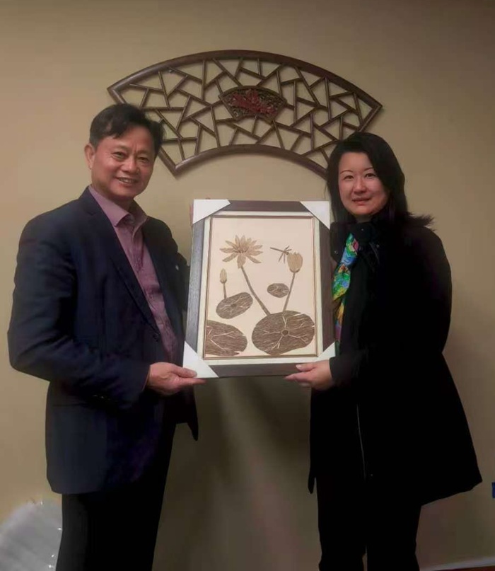 汪科元赠送沉香山文创作品给加州五系中医药大学的Gina Huang副校长。