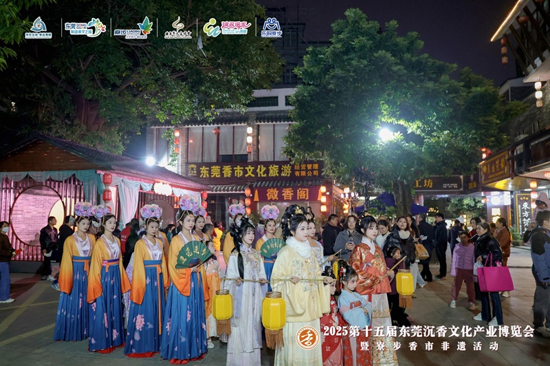 作为寮步香市的核心载体,牙香街既是国家级非物质文化遗产老街,也是明清时期香市繁盛的历史见证。夜色降临时,街区被重新唤醒:文创展示、沉浸品香、香音雅集、非遗手作、寻香打卡与知识闯关等活动沿街铺陈;古筝、二胡、笛子、古琴与古埙的旋律在灯影与人声之间缓缓流转,情景舞蹈《遇见香市》在街口展开,把历史中的香市,拉回到当下的步伐与呼吸之中。