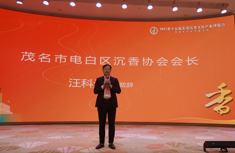 汪科元(电白区沉香协会会长)代表各地沉香协会,感谢东莞香博会组委会为这次展会的辛勤付出,回顾和东莞市沉香协会同仁一起去沙特阿拉伯利雅得考察沉香市场,赞扬东莞市对沉香出海,在中东设立海外货仓的支持。他期盼沉香行业协会携起手来,使中国沉香服务世界,香飘世界。