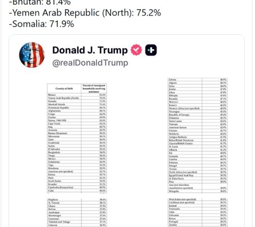 这张图表题为《按原籍国划分的移民福利领取率》,发布于川普自创的社交平台 Truth Social,涵盖约120个国家和地区。图表列出了来自各个国家、出生于当地的移民家庭中,领取某种形式政府援助的比例。