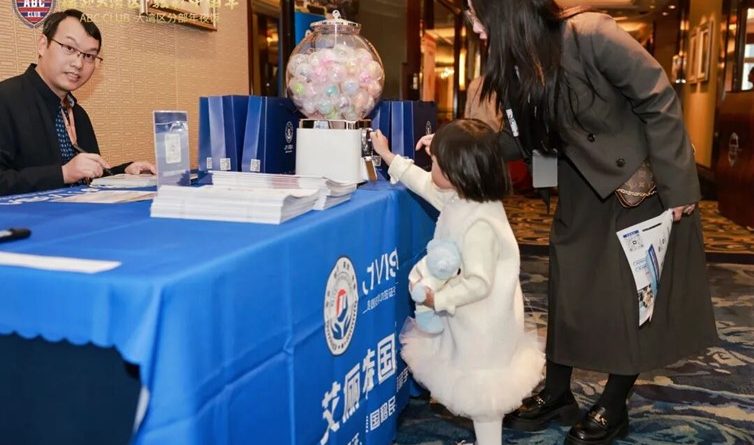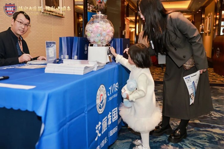 图:美宝俱乐部大湾区晚宴给艾俪特国际设专属站台,介绍Elite美国访学J1签证项目,小美宝前来艾俪特国际的展台“咨询”
